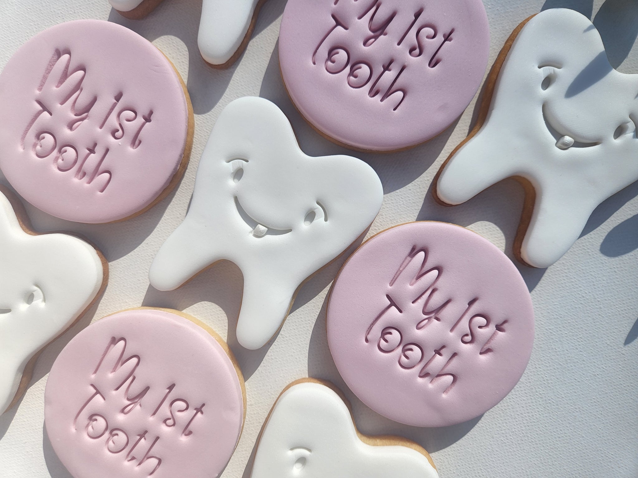 My first tooth stamped onto fondant colour of choice on any shape cookie & a tooth in white fondant