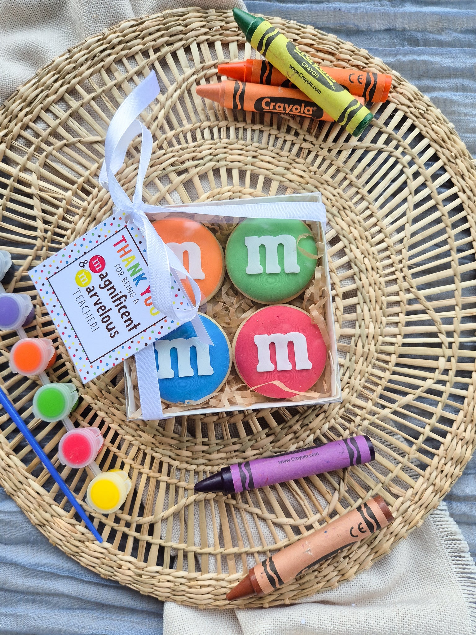 4x 5cm round cookies in assorted m&m colours.